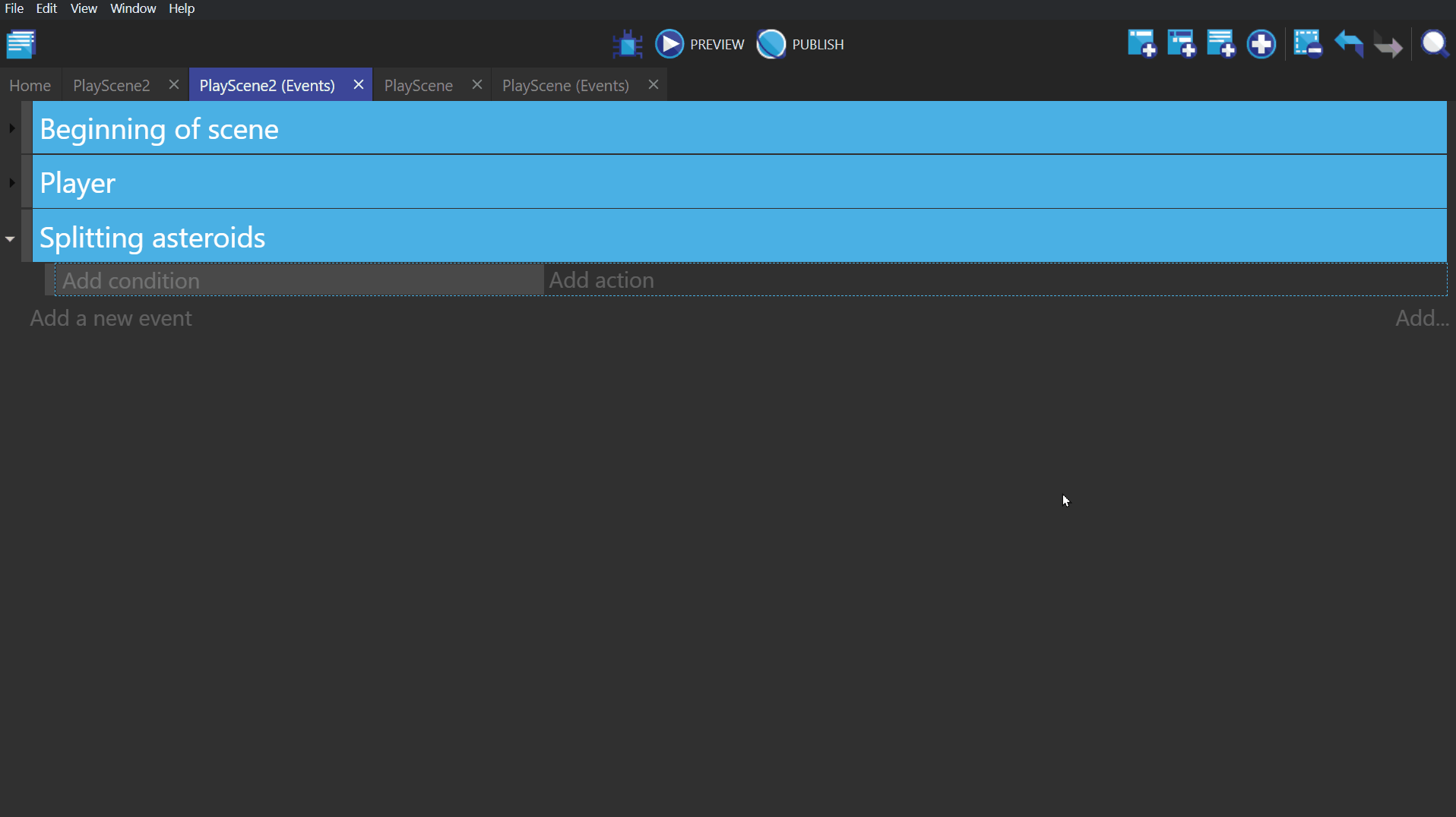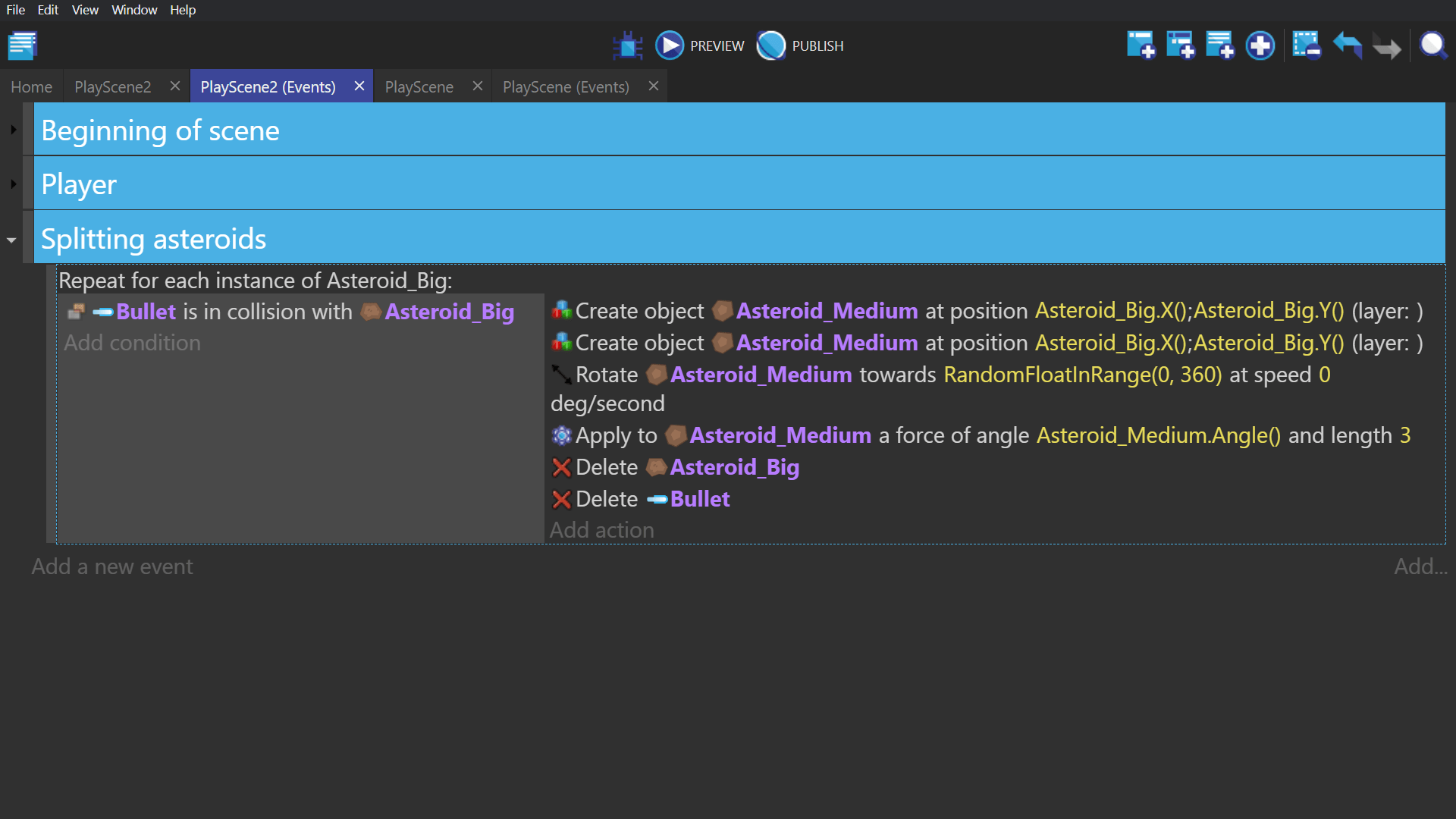 Action: -"Create an object" and select Asteroid_Medium. Set this to create at the X and Y coordinates of Asteroid_Big. -Copy and paste that "Create an object" action in to the same event, so a second medium asteroid is created when the big asteroid is destroyed. -"Rotate toward angle" setting RandomFloatInRange(0, 360) as the angle to rotate towards, with an angular speed of 0. -"Apply force (angle)" (Physics Engine) setting the angle to be the angle of the medium asteroids. With a length of 3. -"Delete the object" and select the big asteroid. -"Delete the object" and select the bullet.