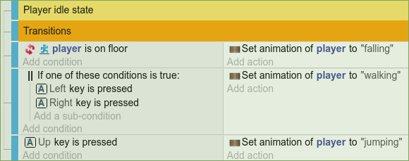 Instead of the animation, we could have created here a dedicated Scene Variable "state" to control the player state. This is more advanced but allows for better flexibility. However, the approach presented here has the benefit of bundling the logic with the corresponding animation, allowing for clarity and simplicity in the event sheet. Furthermore, you have access to the frames of the current animation/state and can trigger some logic at a certain frame inside the animation.